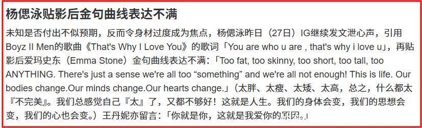 杨偲泳用这种方式表达了对外界只关注她身材的不满。