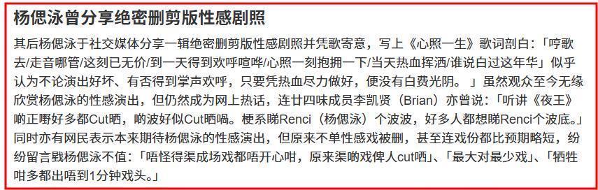 随着《夜王》上映,不少网友发现影片中杨偲泳的不少激情戏份被删除了。