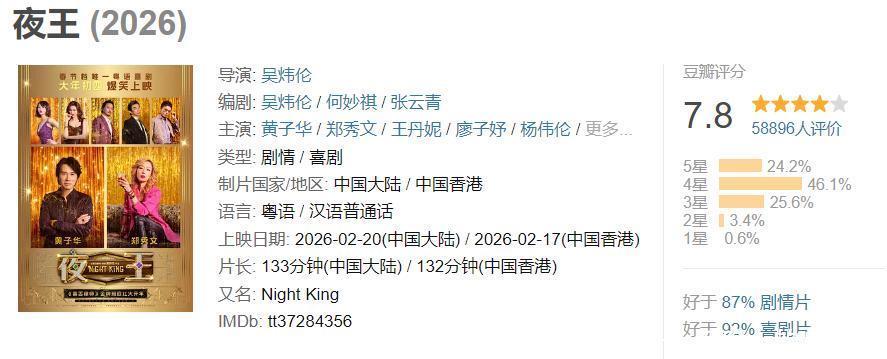 与这三部电影相比,来自香港的贺岁片《夜王》在票房上就要逊色得多,票房目前仅仅突破1.3亿。